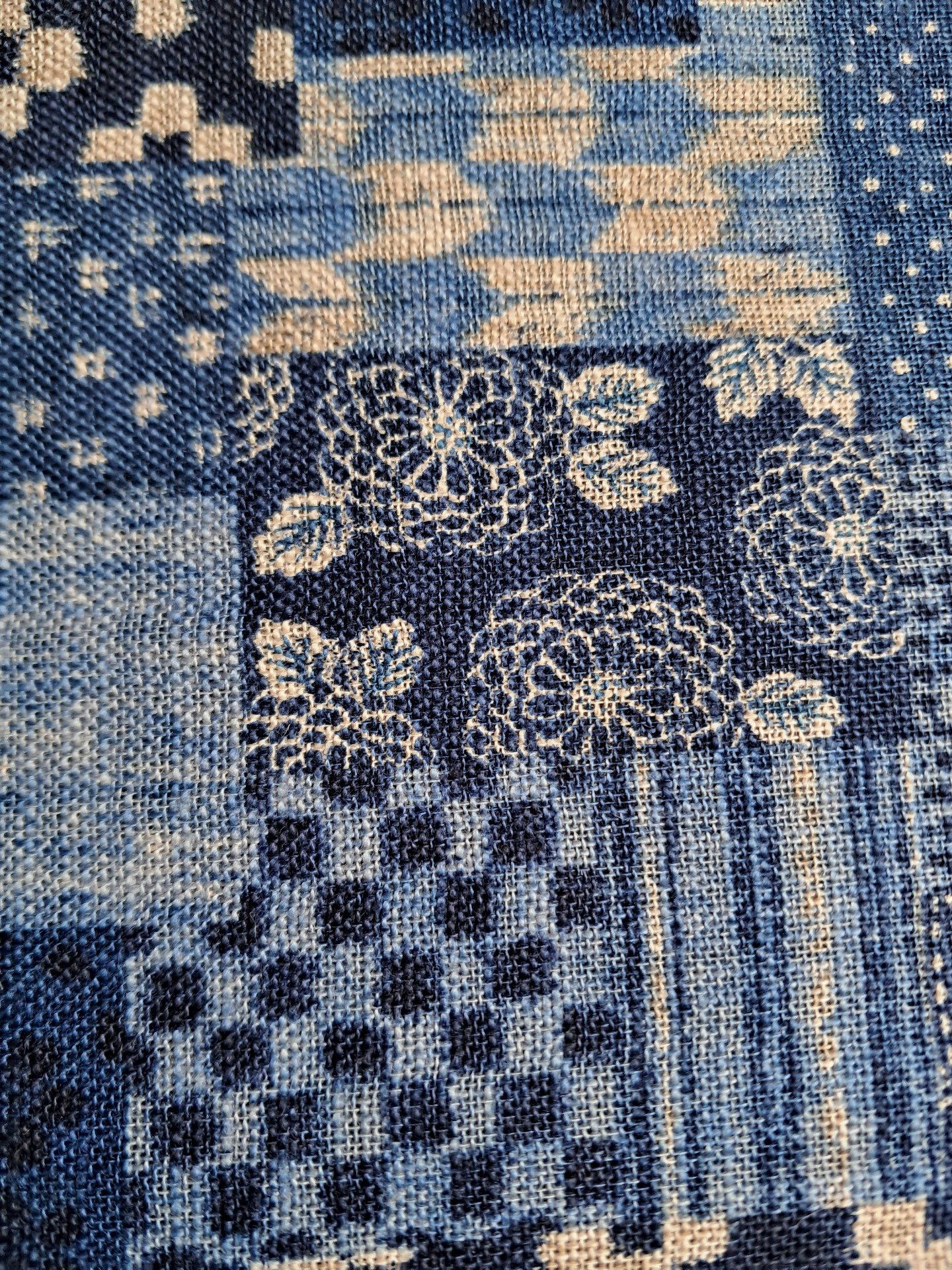 Motifs japonais kiku, asanoha, yagasuri ... dans les tons beige, marron ou bleu foncé sur un fond en camaïeu de bleu, avec une dominance bleu marine.