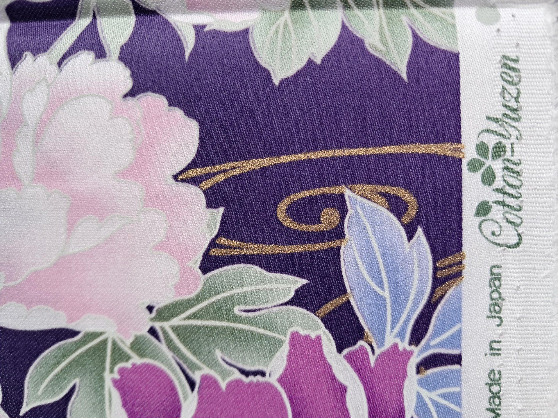 Authentique tissu japonais aux motifs de pivoines dans les tons roses, blancs et violets sur un fond violet. Des lignes dorées viennent sublimer l'ensemble.