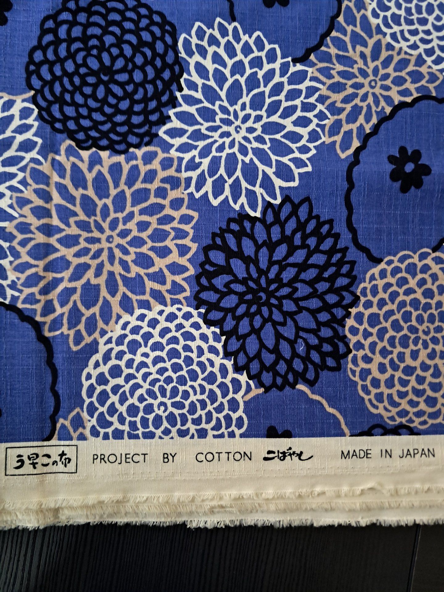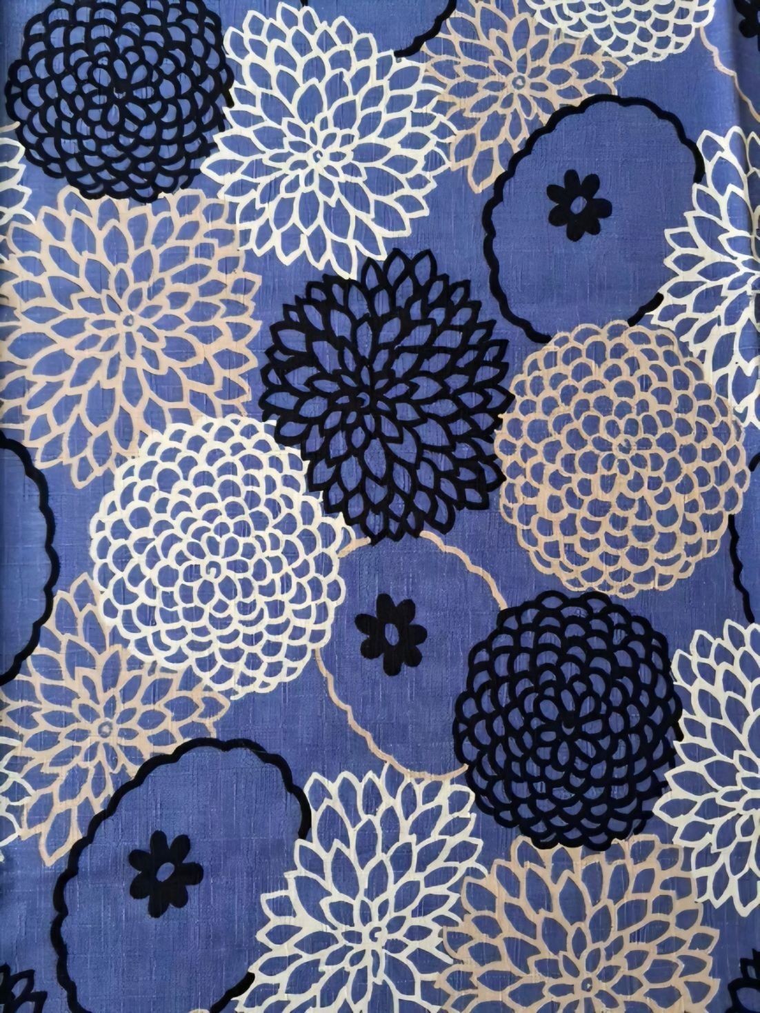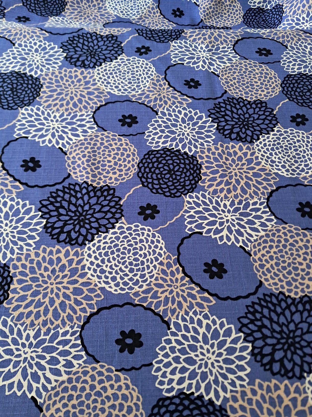 Très joli tissu de la marque japonaise Kobayashi aux motifs de chrysanthèmes de différentes couleurs sur fond bleu.