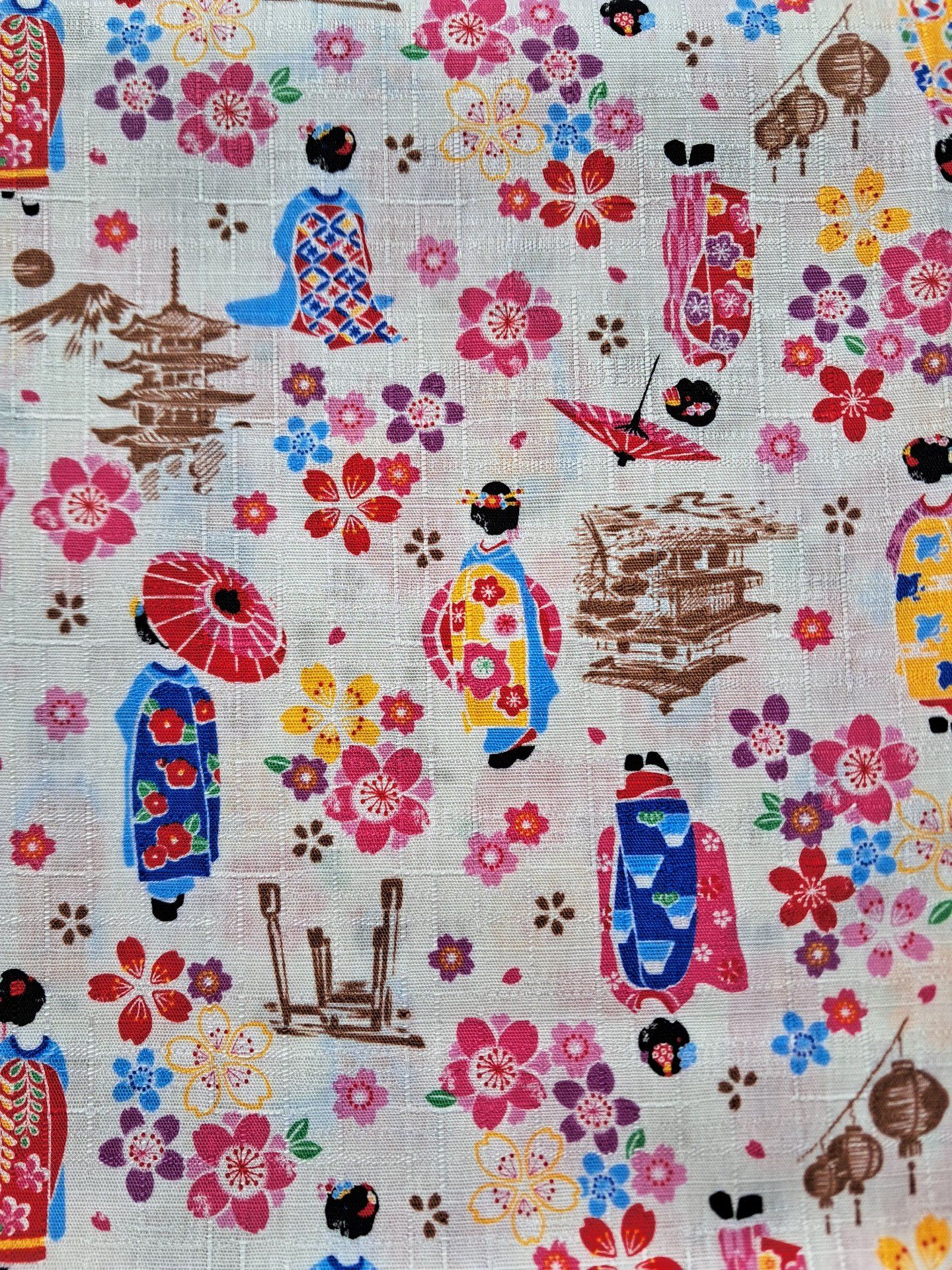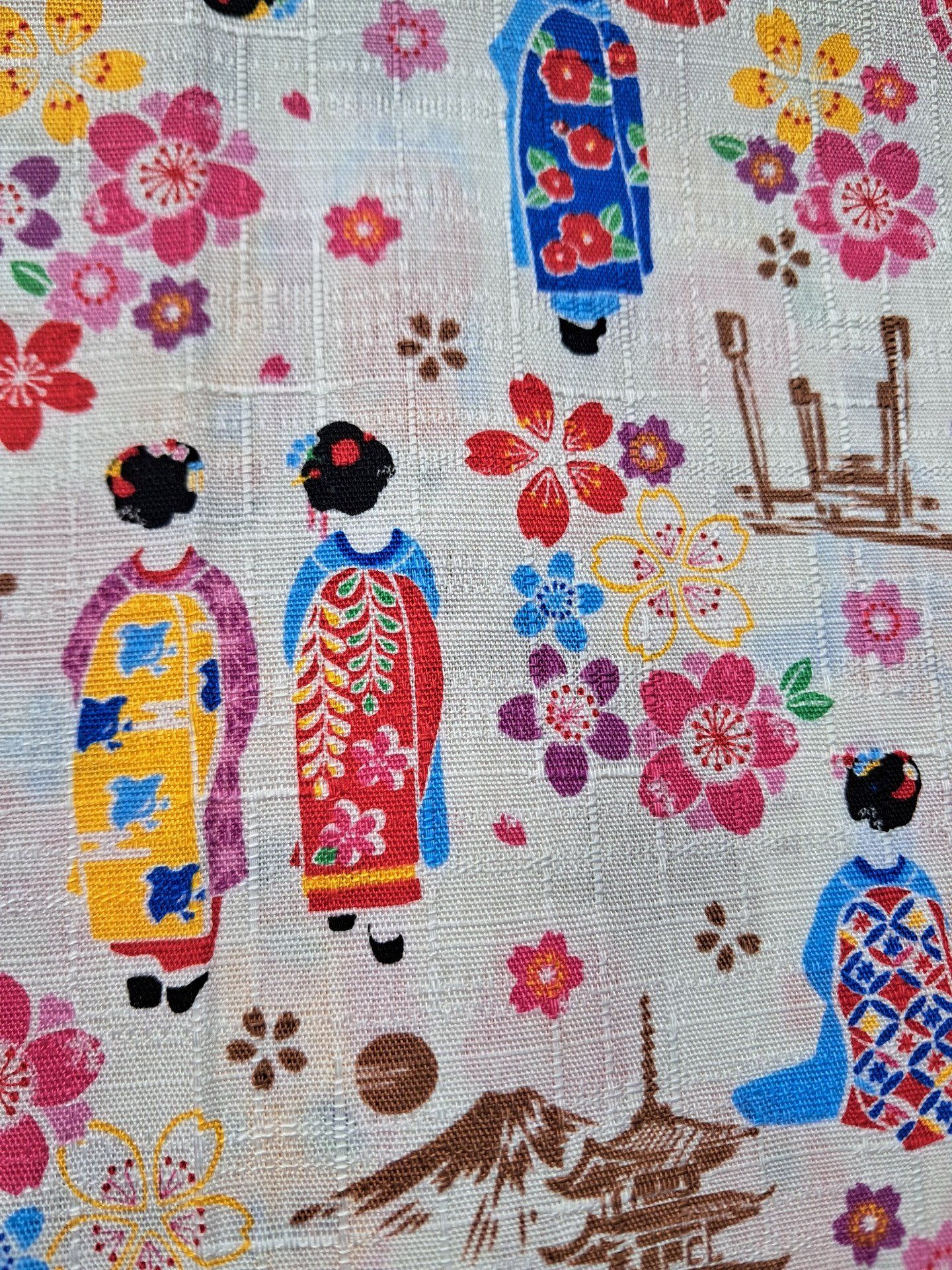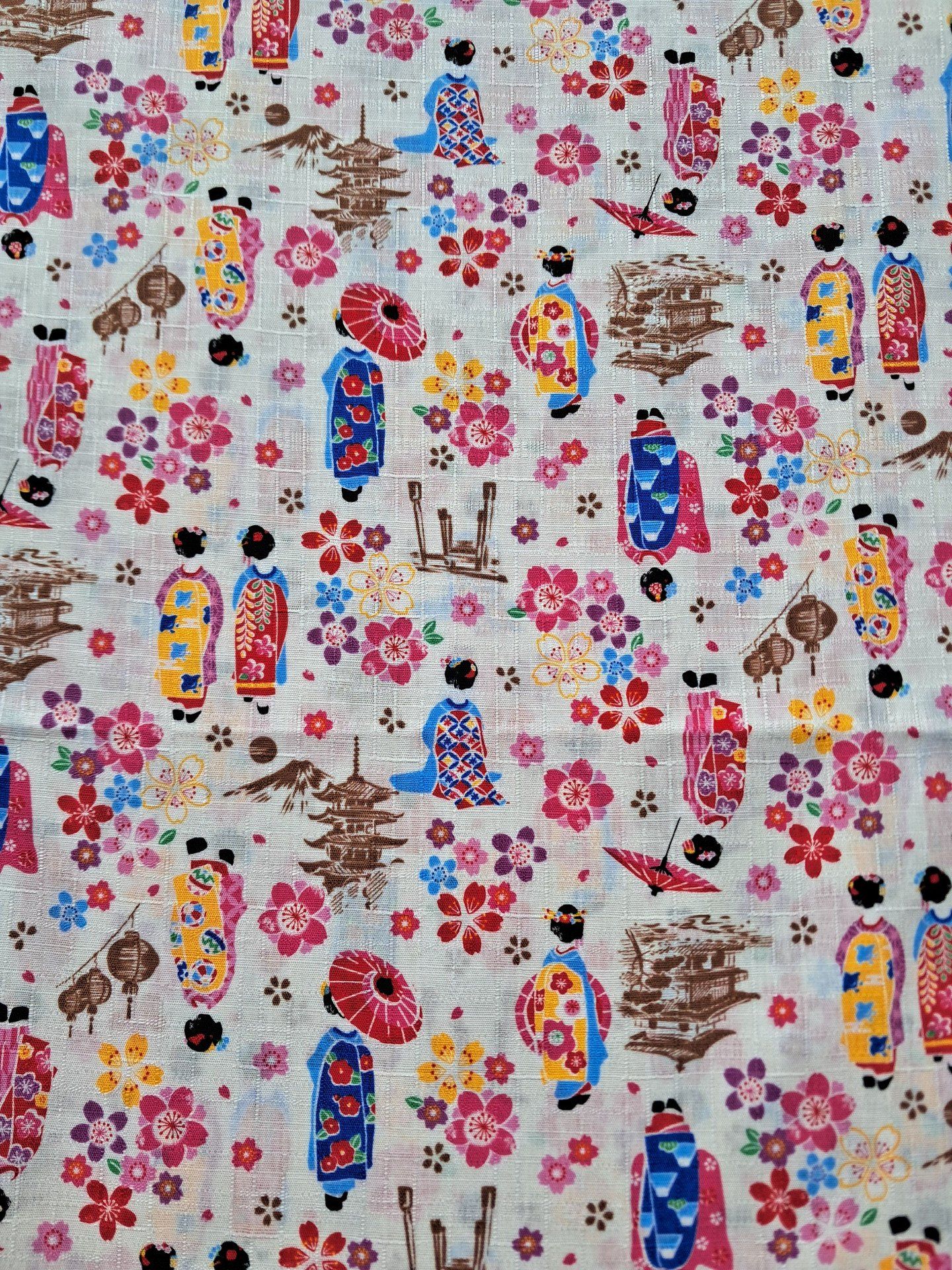 Très joli tissu représentant des Maiko dans un paysage de Sakura, pagodes et Torii.