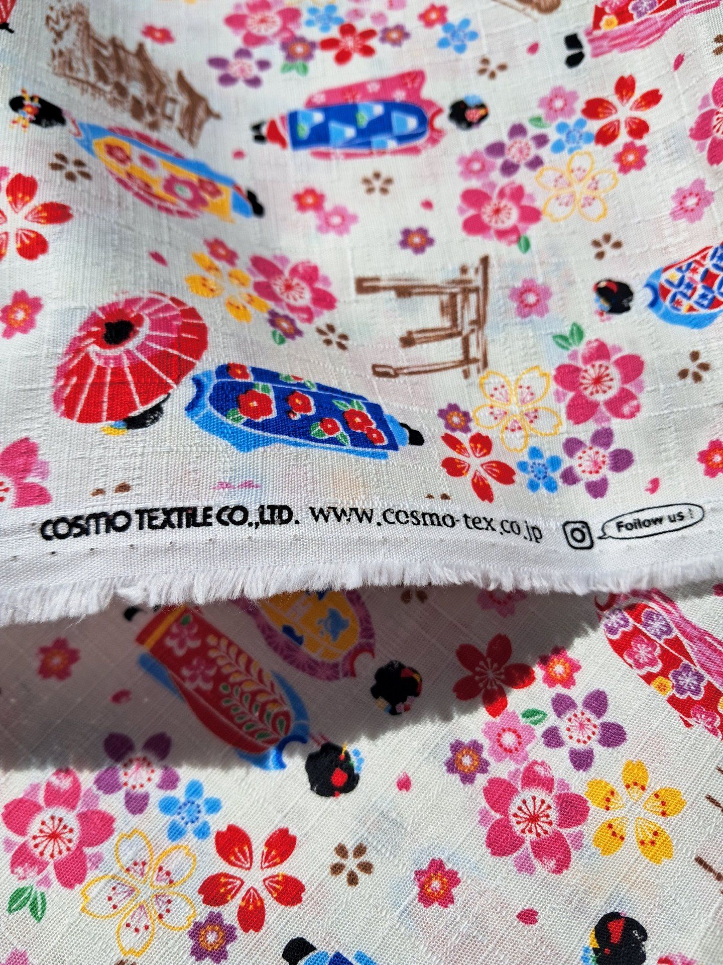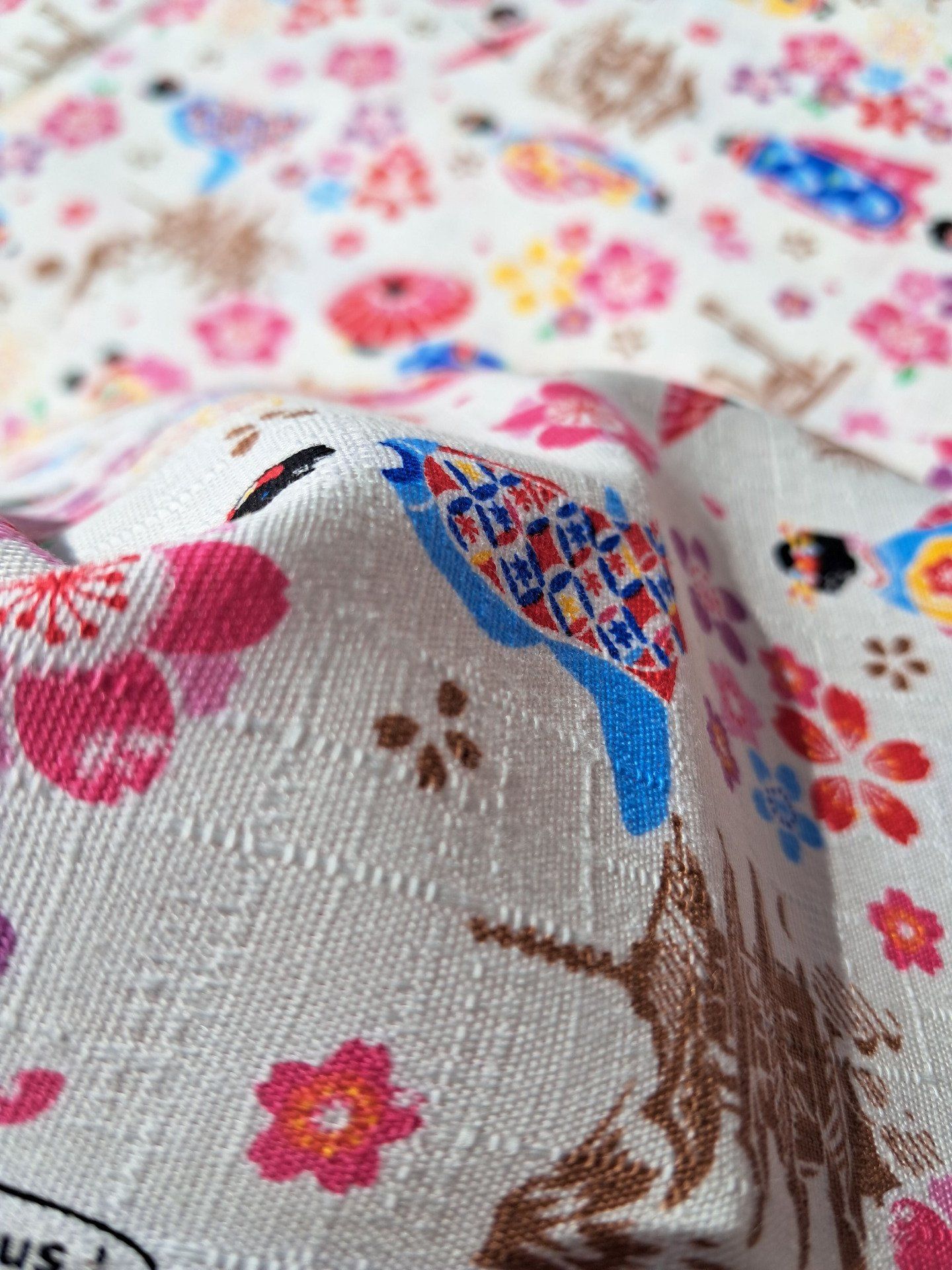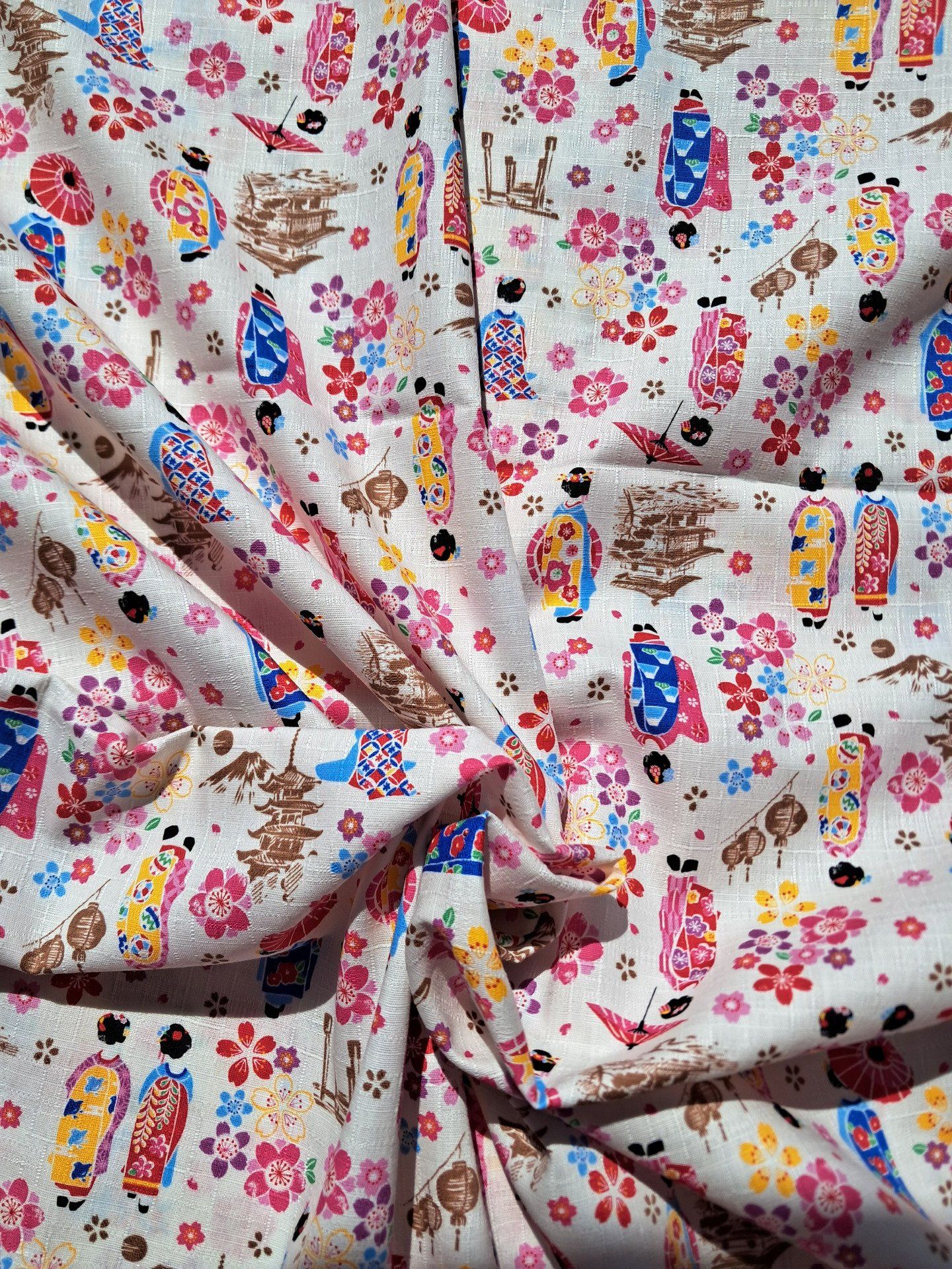 Très joli tissu représentant des Maiko dans un paysage de Sakura, pagodes et Torii.