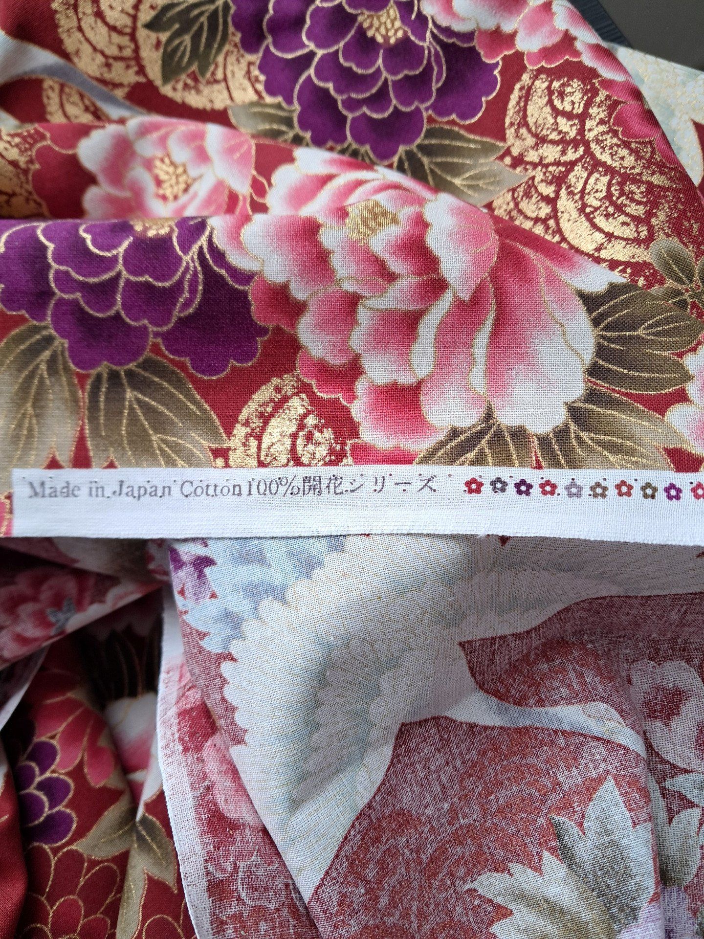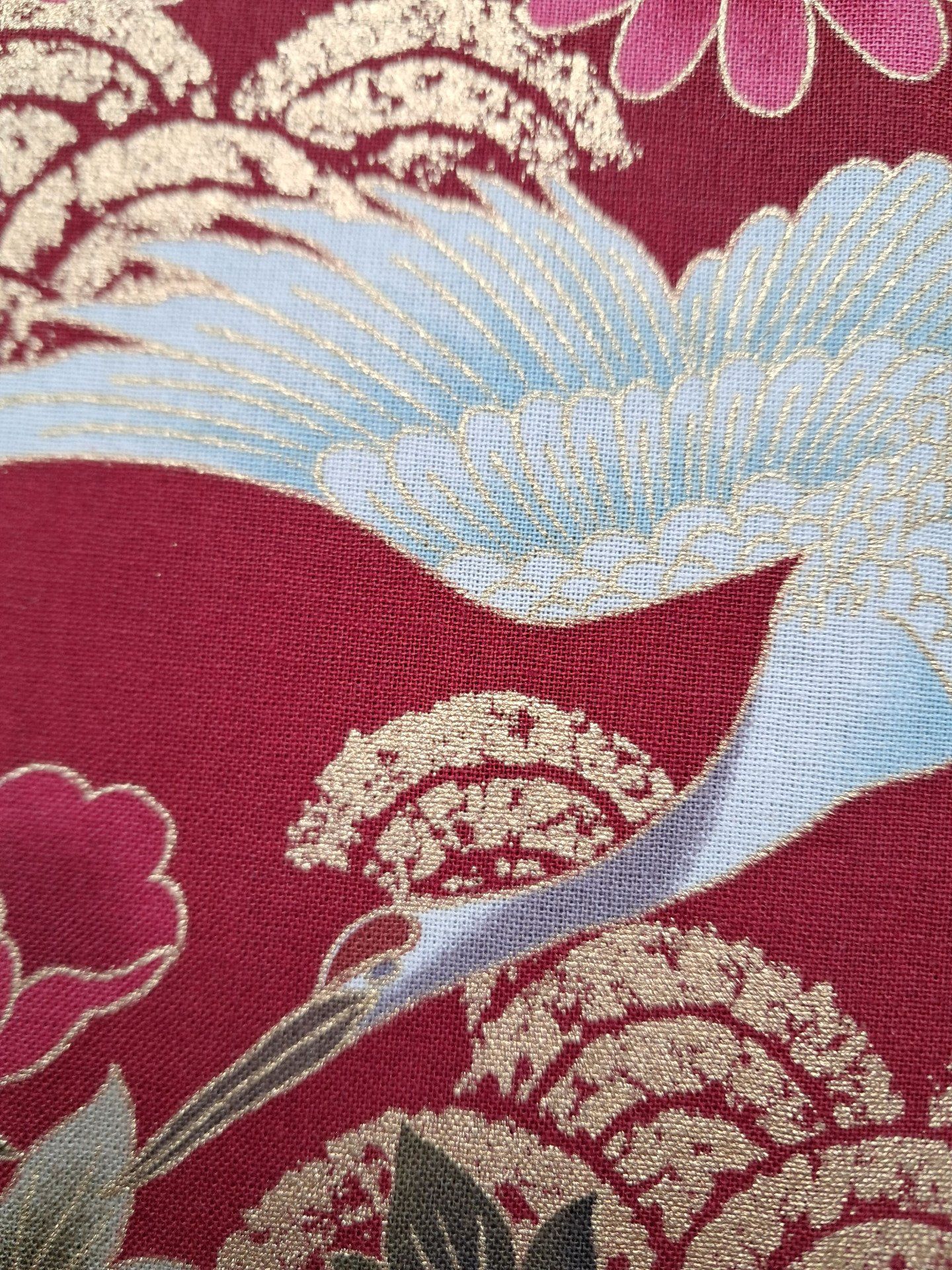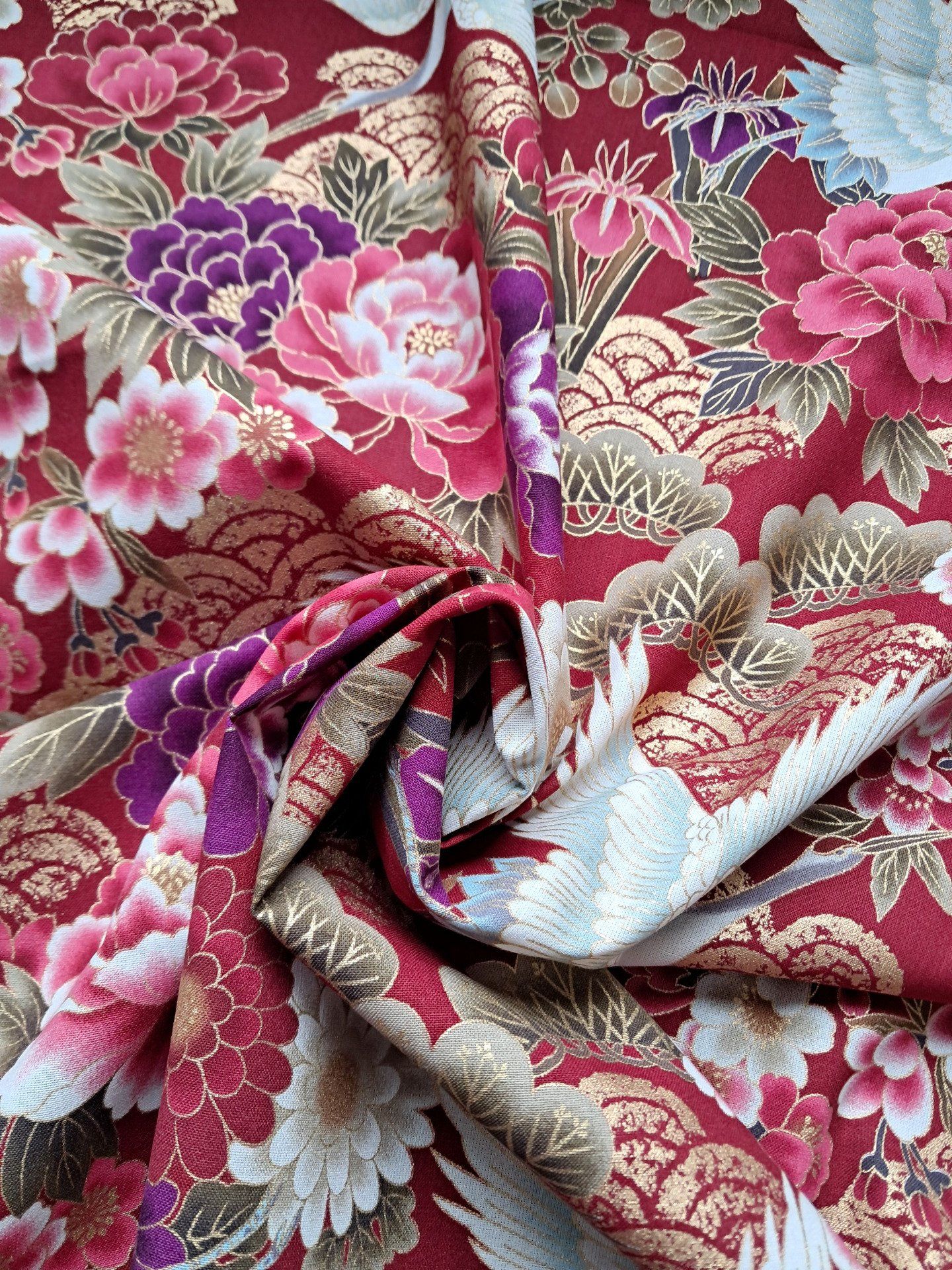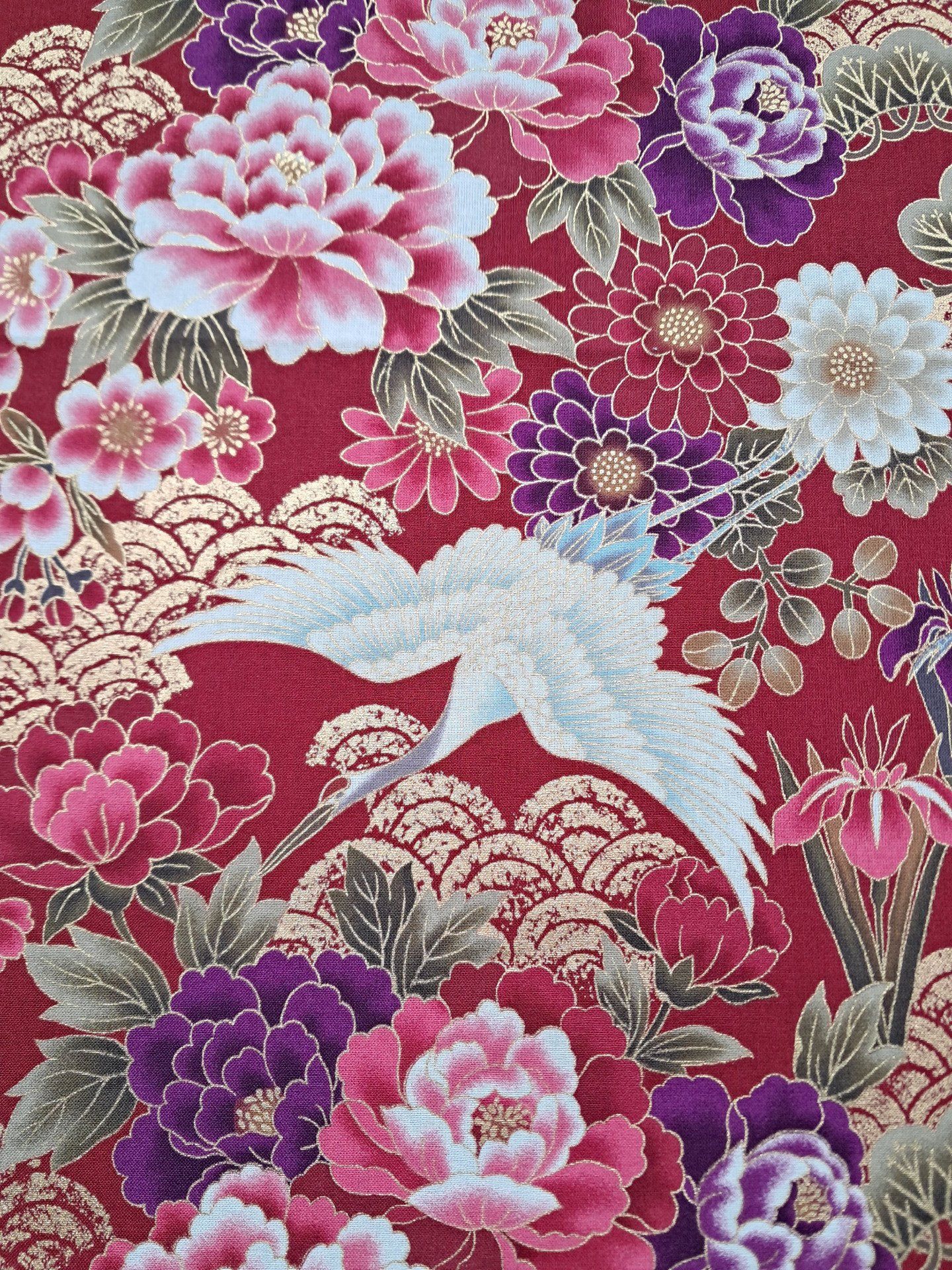 Très beau tissu Made in Japan composé de héron et de motifs fleuris dans les tons violets, roses, rouges et blancs sur un fond rouge.