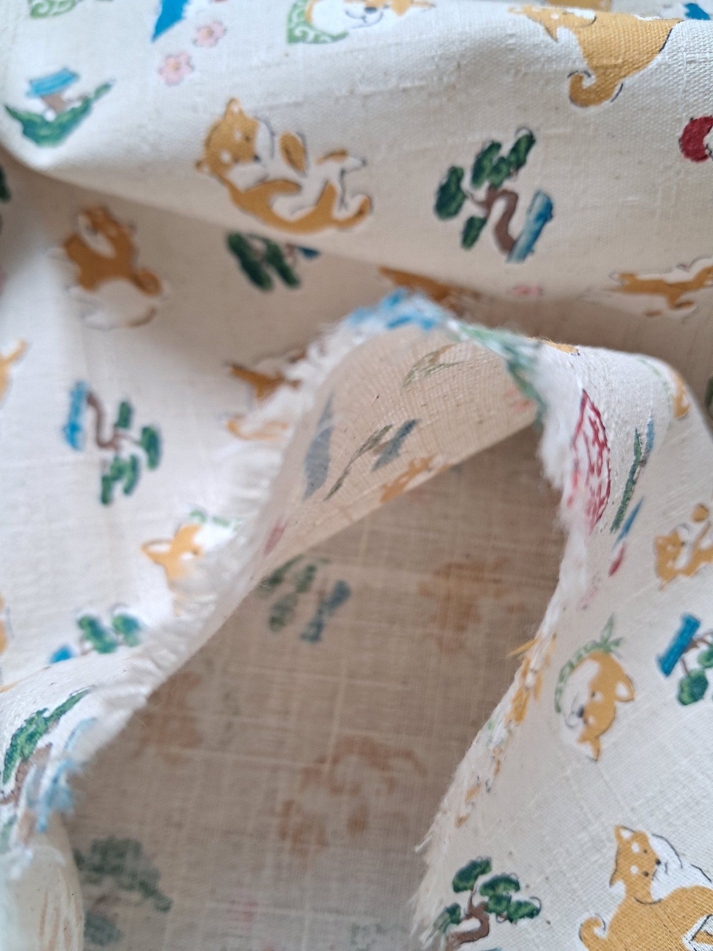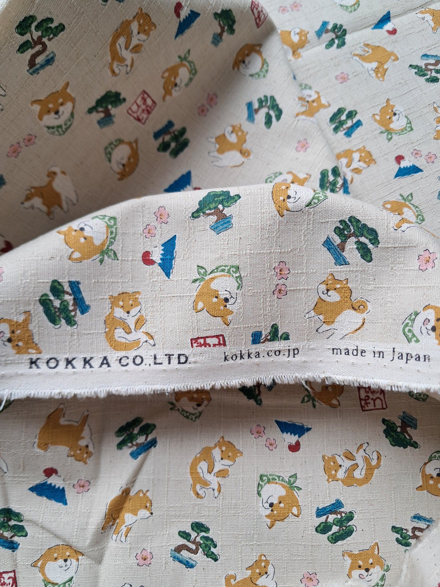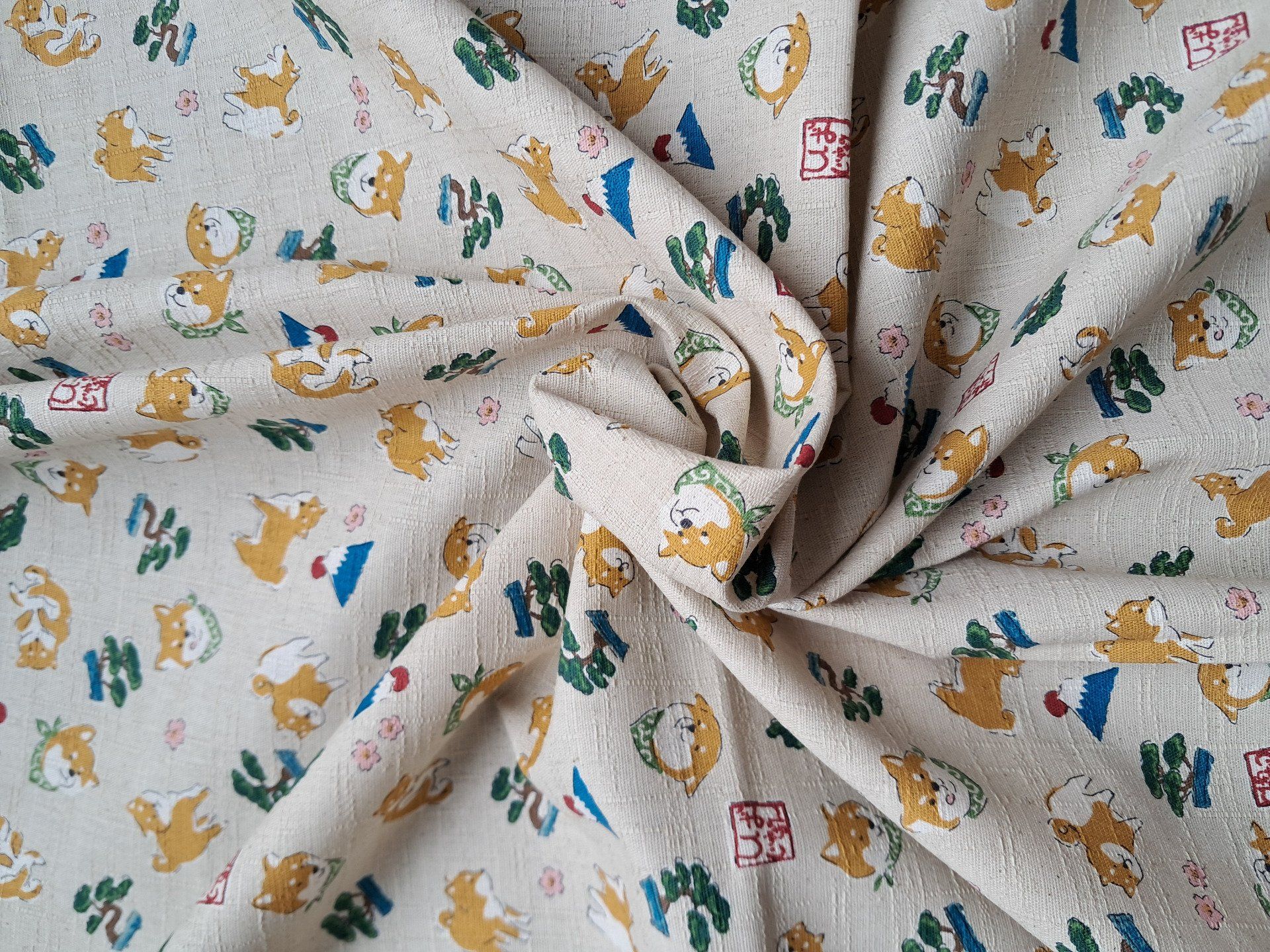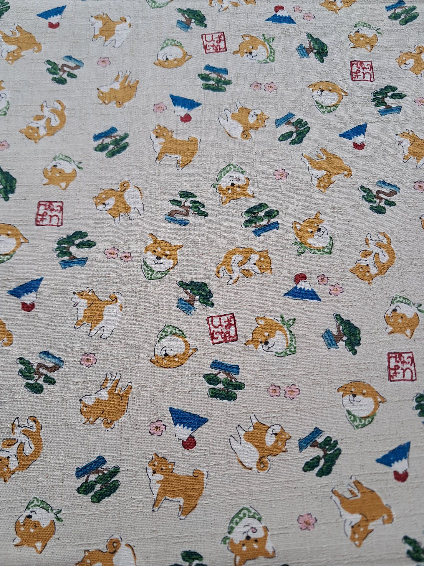 Très joli tissu kawaii représentant des petits chiens Shiba Inu, des bonsais, des petites fleurs Sakura roses, des sceaux rouges et des Mont Fuji sur un fond écru.